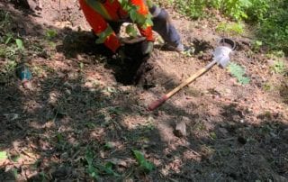 The next stage in the process will typically be a soil rejuvenation. Urban soils are often lacking in nutrients, oxygen, and water availability – even in the ravine system. By using a supersonic air-spade tool, we aerate the soil by creating columns, then backfill those columns with custom compost and biochar. This improves the structure of the soil in two ways: