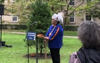 Skahendowaneh Swamp, chair of Indigenous knowledge at the Chanie Wenjack School for Indigenous Studies at Trent University and a Wolf Clan Faith Keeper of the Mohawk Nation, opened the ceremony with a Thanksgiving address and later and shared a story about the Peacemaker and the teachings be brought to the Earth. Swamp explained how these teachings help us understand how to respect, love, and welcome one another. He also discussed the significance and symbolism of the White Pine tree in the Peacemaker’s teachings.